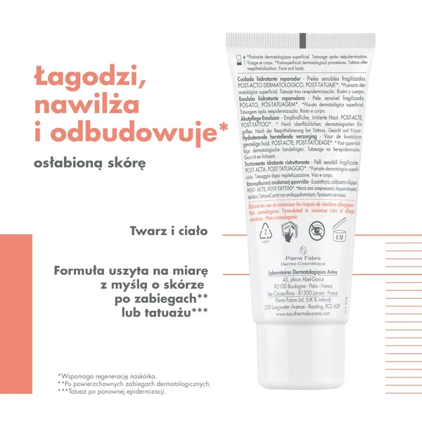 Nawilżająca emulsja regenerująca nawilża i przynosi ukojenie delikatnej skórze wrażliwej osłabionej w wyniku powierzchownych zabiegów dermatologicznych (peeling, zabiegi z użyciem lasera lub mikroigieł itp.) lub zabiegów tatuażu. Specjalnie dostosowana do jej potrzeb formuła o płynnej, bezzapachowej konsystencji jest przez nią bardzo dobrze tolerowana. Cicalfate+ nawilżająca emulsja regenerująca przeznaczona do pielęgnacji wrażliwej skóry twarzy i ciała osób dorosłych i składająca się w 91% ze składników pochodzenia naturalnego pomaga obniżyć dyskomfort (uczucie gorąca, mrowienia itp.), zapewnia długotrwałe nawilżenie i przyczynia się do szybkiej regeneracji podrażnionej skóry wrażliwej. Natychmiast KOI podrażnioną i osłabioną skórę.
