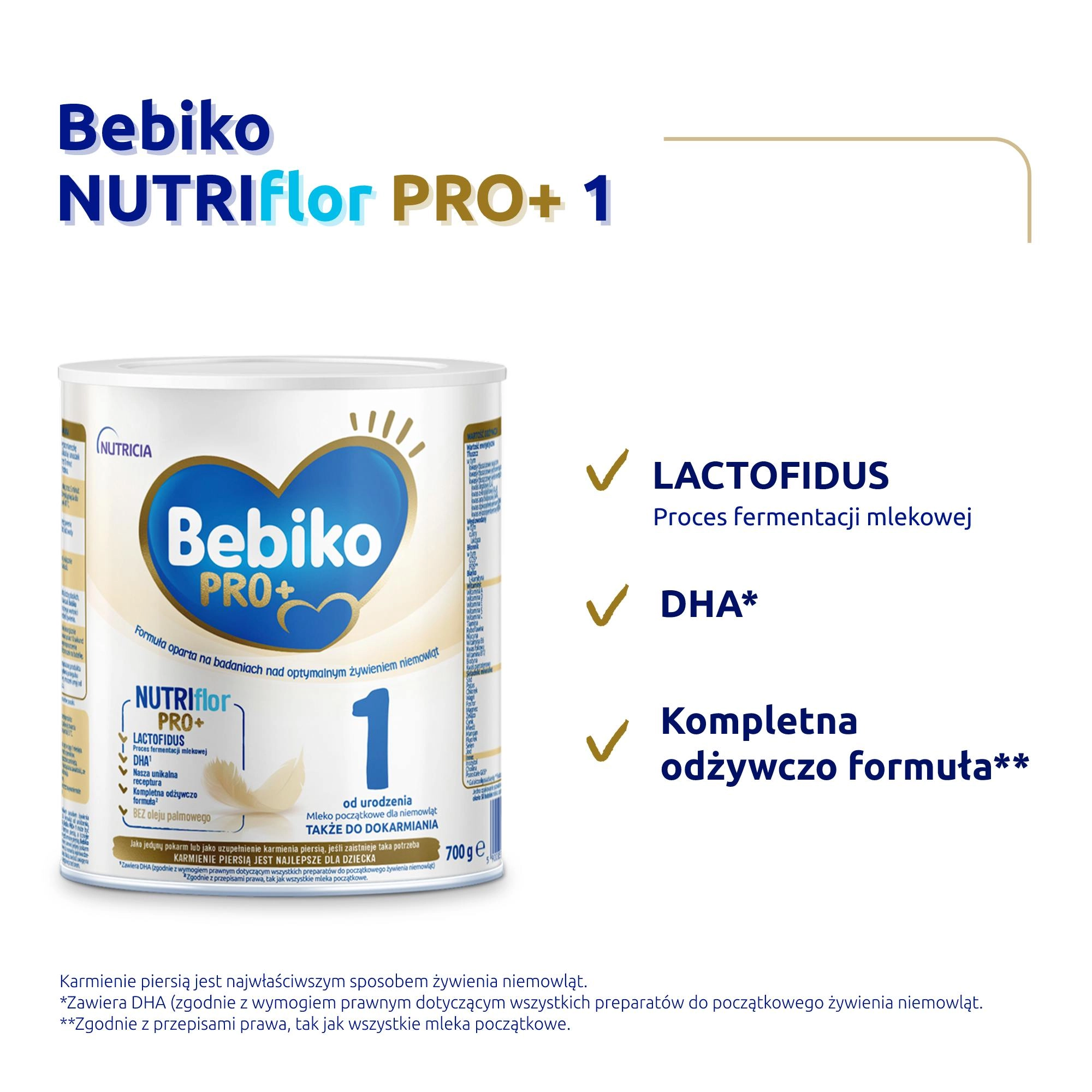Bebiko Pro+ 1 NUTRIflor Pro+ to mleko początkowe w proszku przeznaczone dla niemowląt od urodzenia. Może być stosowane jako jedyny pokarm u niemowląt niekarmionych piersią lub do dokarmiania, gdy dziecko jest karmione piersią i istnieje taka potrzeba. Karmienie piersią jest najlepsze dla dziecka.