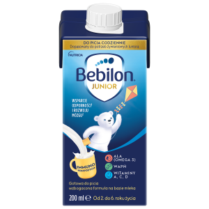 Bebilon Junior do picia to gotowa do spożycia formuła na bazie mleka, wzbogacona w witaminy i minerały, przeznaczona dla dzieci w wieku od 2 do 6 lat.