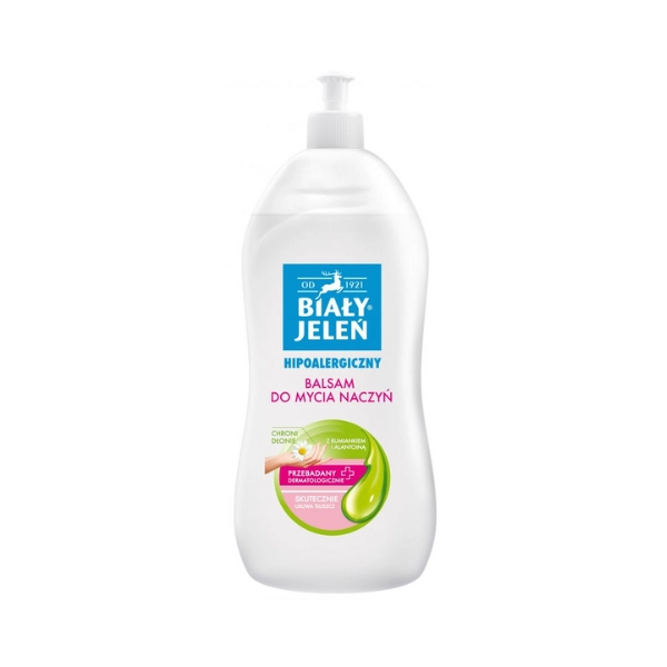 BIAŁY JELEŃ - HIPOALERGICZNY BALSAM DO MYCIA NACZYŃ Z RUMIANKIEM I ALANTOINĄ STWORZONY SPECJALNIE Z MYŚLĄ O OSOBACH Z WRAŻLIWĄ I SKŁONNĄ DO ALERGII SKÓRĄ.