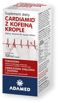 Cardiamid z kofeiną, krople - suplement diety zawierający w swoim składzie kofeinę, witaminę B6 oraz naturalne wyciągi roślinne z owoców głogu, korzenia żeń-szenia i nasion guarany. Preparat przeznaczony dla osób dorosłych.