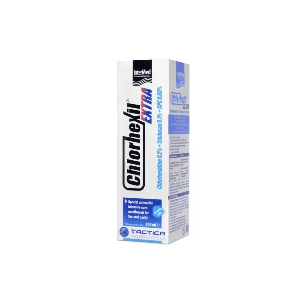 Chlorhexil Extra to intensywny antyseptyczny płyn do pielęgnacji i ochrony jamy ustnej, skutecznie usuwający płytkę nazębną i kontrolujący rozwój flory bakteryjnej. Dzięki zawartości chlorheksydyny, triklosanu i chlorku cetylpirydyny, płyn przeciwdziała zapaleniu dziąseł i skutecznie wspiera higienę po zabiegach stomatologicznych. Formuła jest wolna od alkoholu i zawiera łagodzące działanie rumianku.