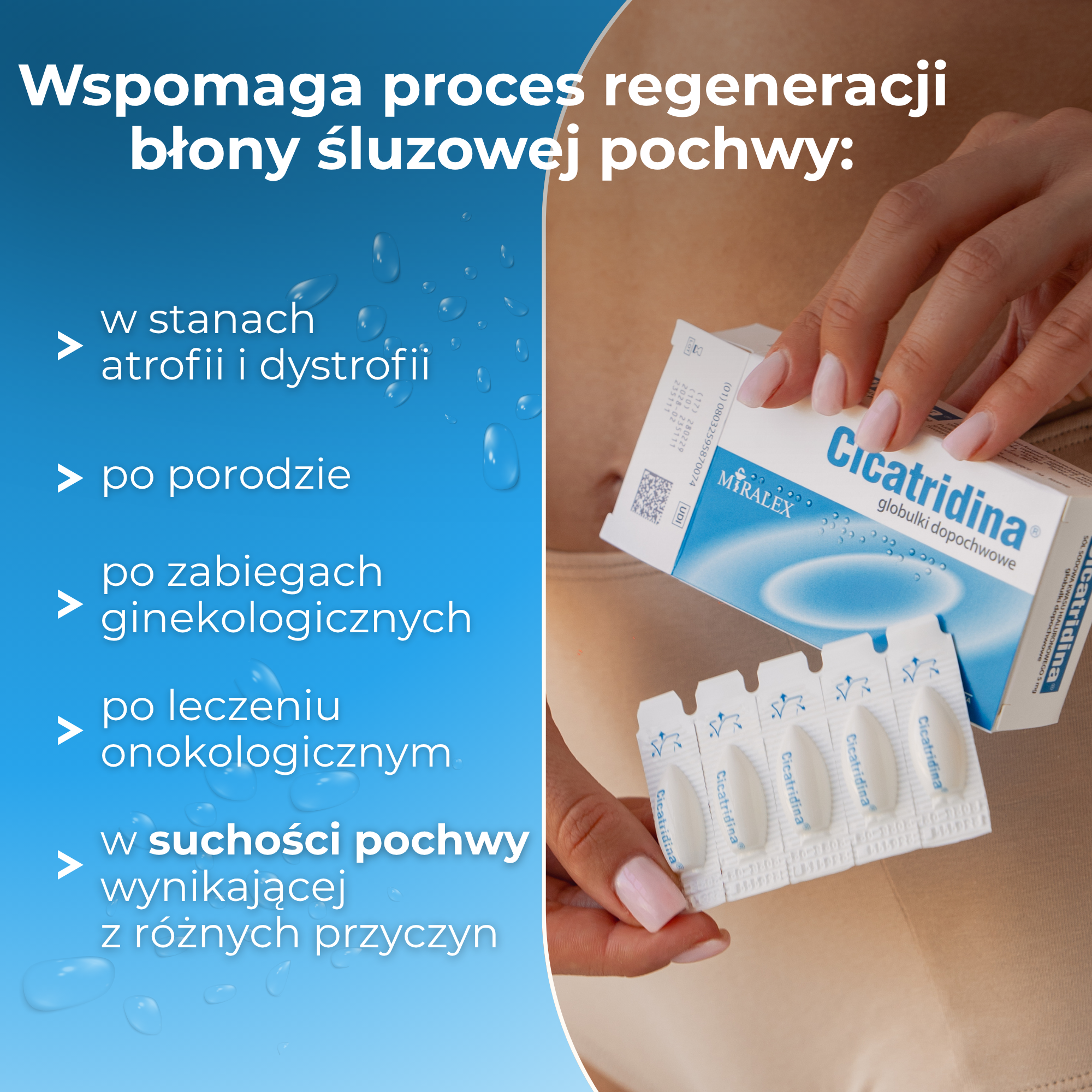 Cicatridina globulki dopochwowe to wyrób medyczny, który wspomaga regenerację błony śluzowej pochwy dzięki swoim nawilżającym i kojącym właściwościom. Zawiera kwas hialuronowy oraz wyciągi roślinne z nagietka, aloesu, centeli azjatyckiej i olejek z drzewa herbacianego, które razem wspomagają łagodzenie objawów takich jak pieczenie, suchość i ból przy stosunku. Zalecana po porodzie, operacjach ginekologicznych oraz w okresie menopauzalnym. Może być stosowany przez dłuższy czas w przypadku potrzeb.