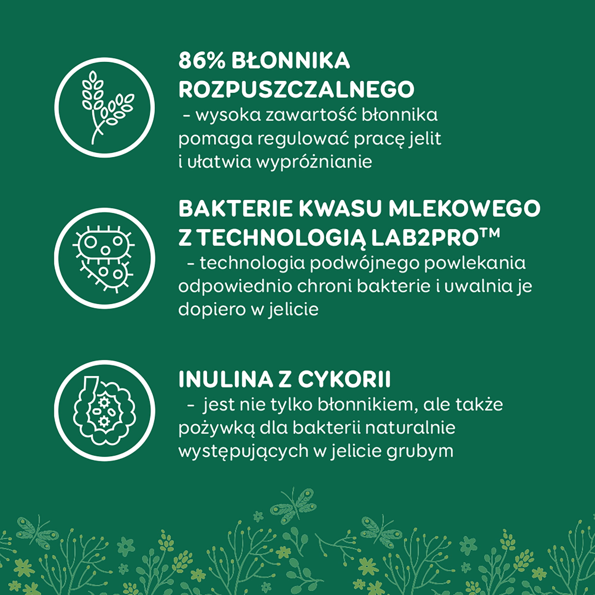 Ma unikalny skład (wysoka zawartość błonnika, żywe kultury bakterii kwasu mlekowego w opatentowanej otoczce LAB2PRO™ oraz inulina z cykorii).