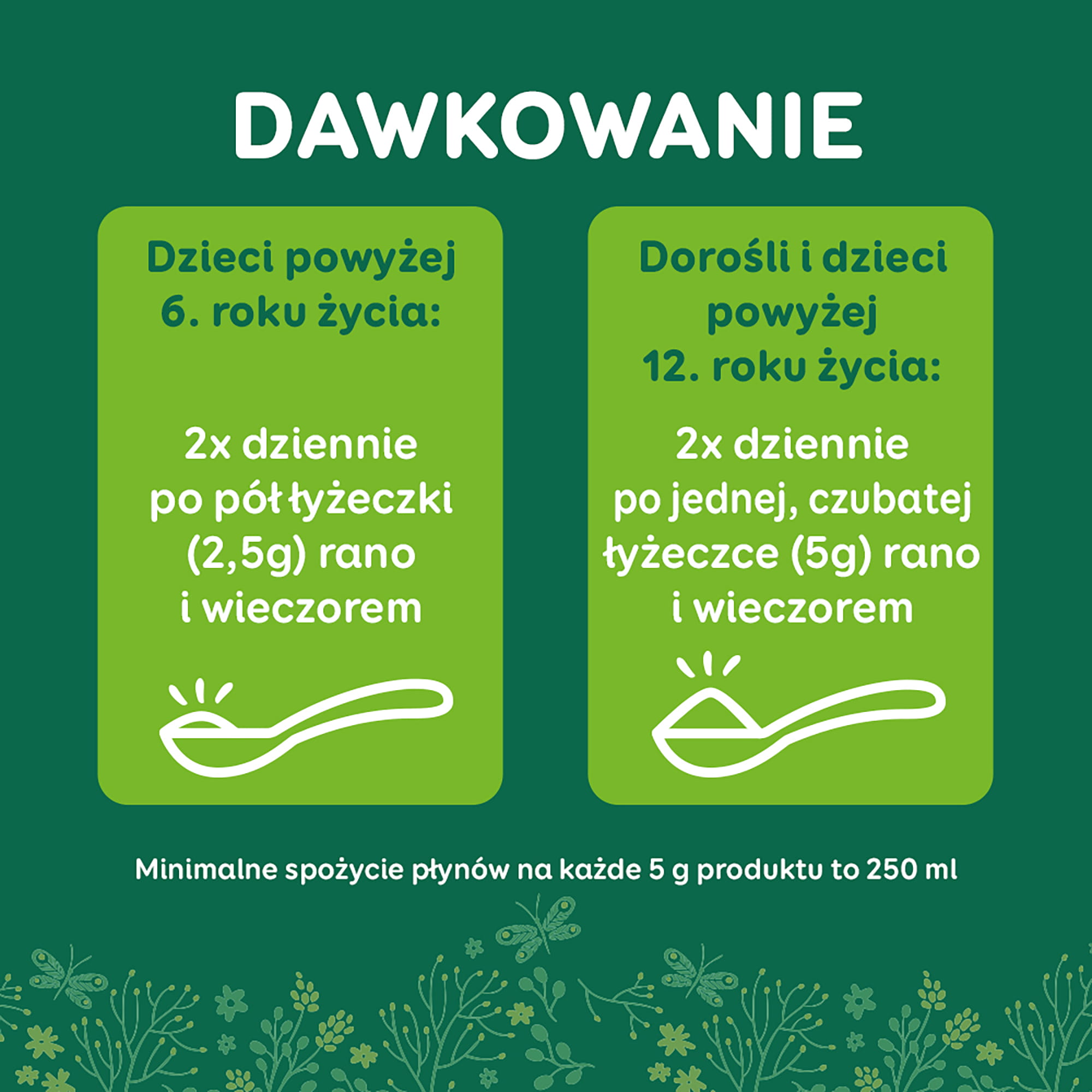 Dorośli i dzieci powyżej 12. roku życia: 1 czubata łyżeczka (5 g) dwa razy dziennie (rano i wieczorem).