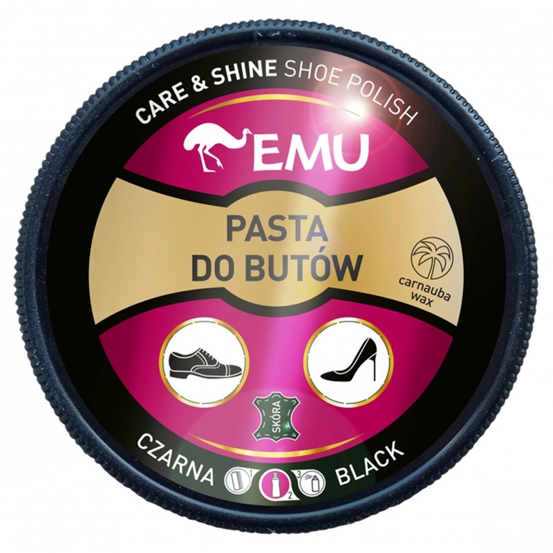 EMU Pasta do butów czarna to klasyczna pasta zamknięta w wygodnej, nowoczesnej puszce. Przeznaczona jest do podstawowej pielęgnacji obuwia ze skóry naturalnej (m.in. licowej), skóry ekologicznej oraz materiałów syntetycznych. Nabłyszcza, konserwuje i zabezpiecza powierzchnię, a czarny pigment pomaga pogłębić kolor i odświeżyć wygląd butów. Formuła na bazie wody została wzbogacona o wosk (m.in. Carnauba), dzięki czemu tworzy delikatną warstwę ochronną i wspiera odporność obuwia na czynniki atmosferyczne.
