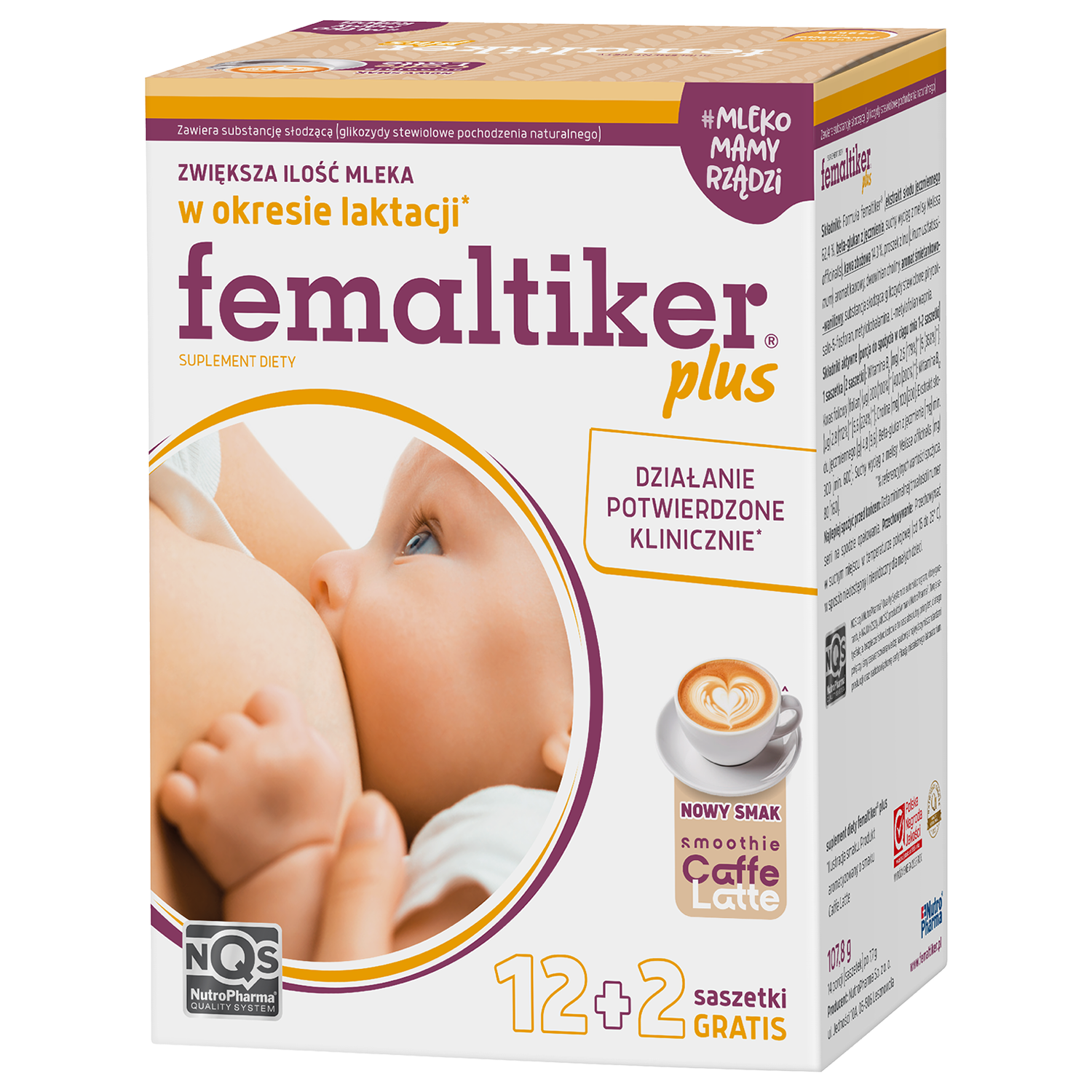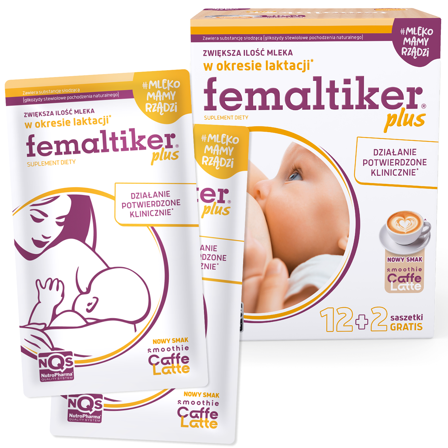 Suplement diety Femaltiker Plus pomagający w zwiększaniu ilości mleka dla kobiet karmiących piersią, dostępny w smaku caffee latte. W wspieraniu laktacji wspiera jęczmienny beta-glukan oraz melisa lekarska.