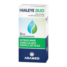 Hialeye Duo to intensywnie nawilżające krople do oczu, które zapewniają natychmiastową ulgę i długotrwałe działanie nawilżające. Wyrób posiada właściwości ochronne i antyoksydacyjne oraz wspomaga regenerację powierzchni oka. Krople mają neutralne pH, nie zawierają środków konserwujących oraz są odpowiednie dla osób o wrażliwych oczach oraz noszących soczewki kontaktowe. Preparat łagodzi swędzenie, pieczenie, podrażnienie, czasowe pogorszenie ostrości widzenia oraz uczucie ciała obcego w oku.