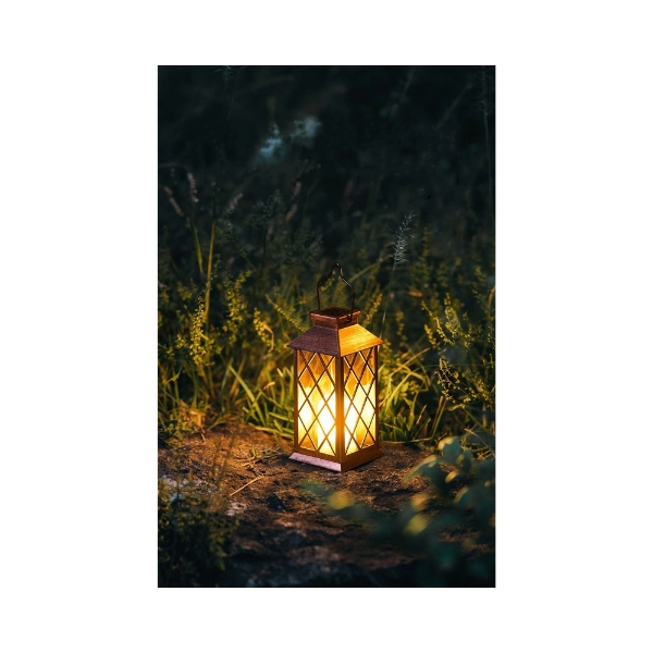 Lampa ogrodowa o designie rustykalnej latarenki wykonana z trwałych materiałów, zapewniająca 6 godzin świecenia. Posiada wbudowany akumulator oraz amorficzny panel solarny ładowalny w pochmurne dni.