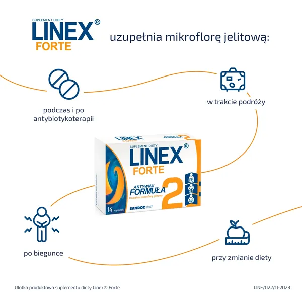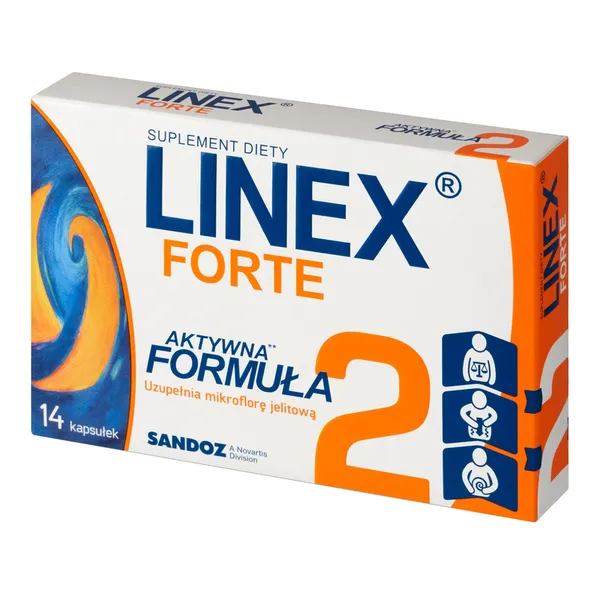 Linex Forte to suplement diety przeznaczony dla dzieci powyżej 3 roku życia oraz dorosłych, stworzony w celu wsparcia odbudowy florą bakteryjną jelit w trakcie terapii antybiotykowej i w okresie rekonwalescencji. Produkt zawiera szczepy Lactobacillus acidophilus LA-5® i Bifidobacterium animalis subsp. lactis BB-12®, które wspomagają prawidłowe funkcjonowanie przewodu pokarmowego. Składniki takie jak inulina i oligofruktoza działają jako prebiotyki, wspierając rozwój pożytecznych bakterii jelitowych.