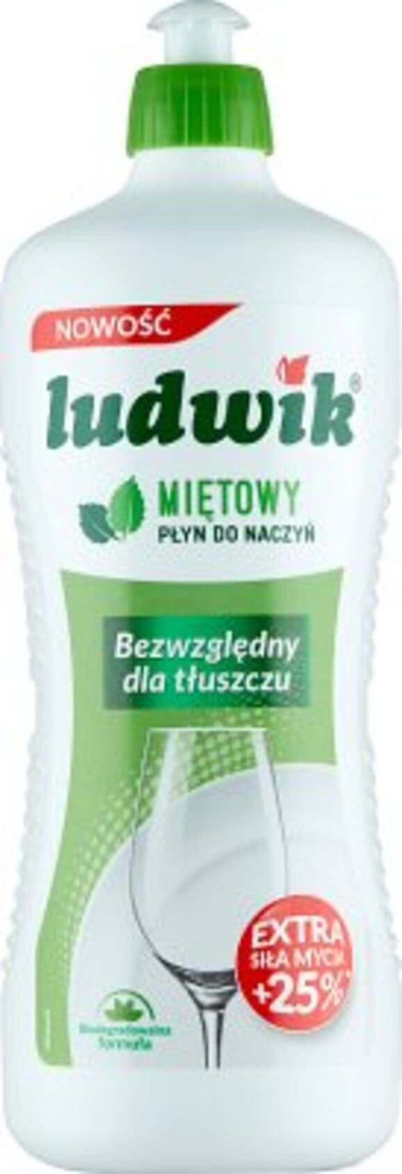 Ludwik Płyn do mycia naczyń miętowy. Bezwzględny dla tłuszczu, pozostawia czyste i lśniące naczynia bez zacieków, przeznaczony do mycia w ciepłej i zimnej wodzie, receptura z kompleksem witamin, posiada malinowy zapach, przebadany dermatologicznie, łagodny dla dłoni, ulega biodegradacji.