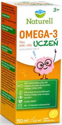 Suplement diety Naturell Omega-3 Uczeń to wysokiej jakości olej rybi do bezpośredniego spożycia o pysznym cytrynowym smaku, bogaty w kwasy omega-3: DHA i EPA, przeznaczony dla dzieci już od 3 roku życia.