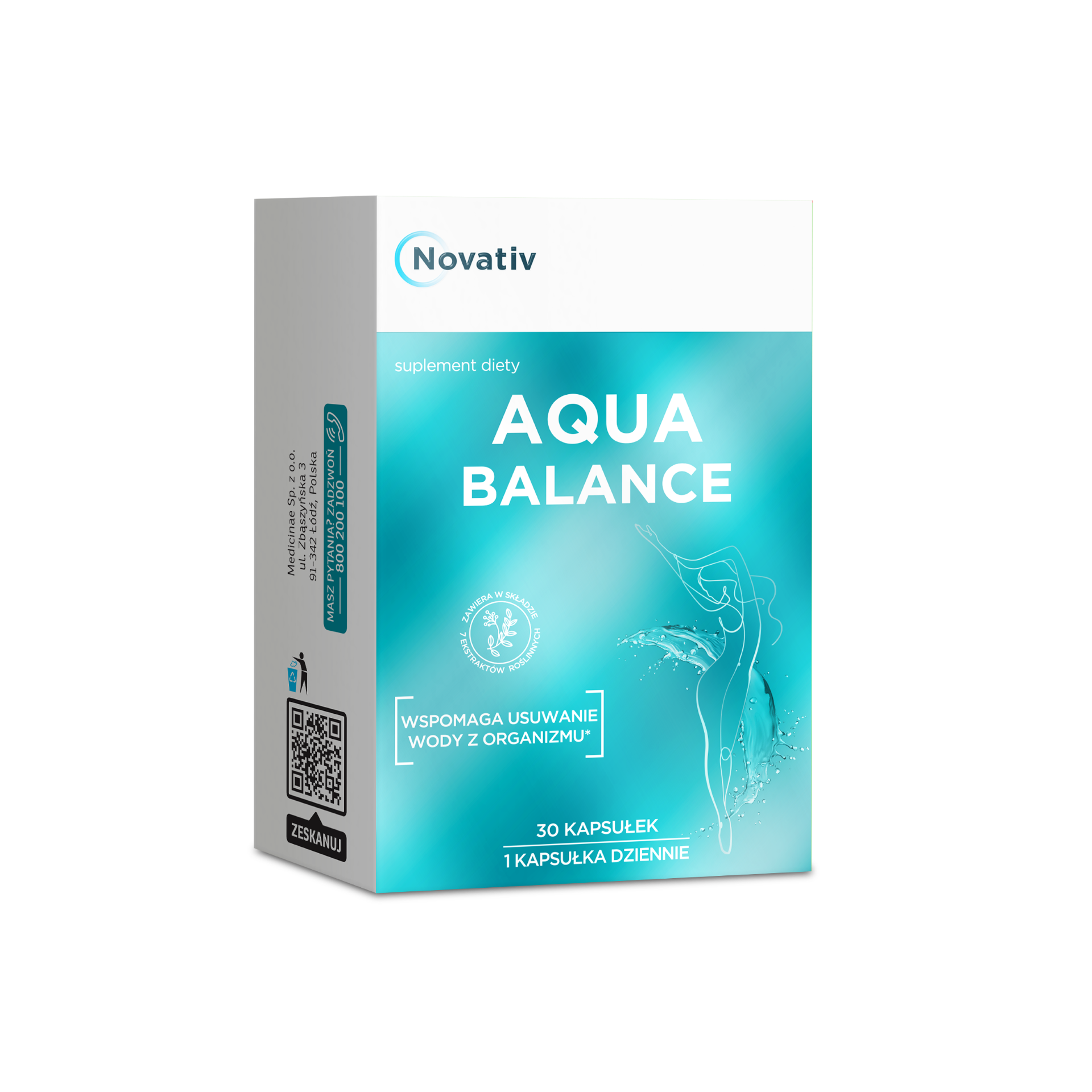Novativ AquaBalance to suplement diety, który pomaga usuwać nadmiar wody z organizmu dzięki zawartości 7 roślinnych ekstraktów. Działa korzystnie na równowagę wodno-elektrolitową organizmu. W jego skład wchodzą ekstrakty m.in. z pokrzywy zwyczajnej, owoców opuncji figowej, pestek winogron o standaryzowanej zawartości polifenoli, liści zielonej herbaty, korzenia mniszka lekarskiego oraz ziela nawłoci pospolitej i rdestu ptasiego.