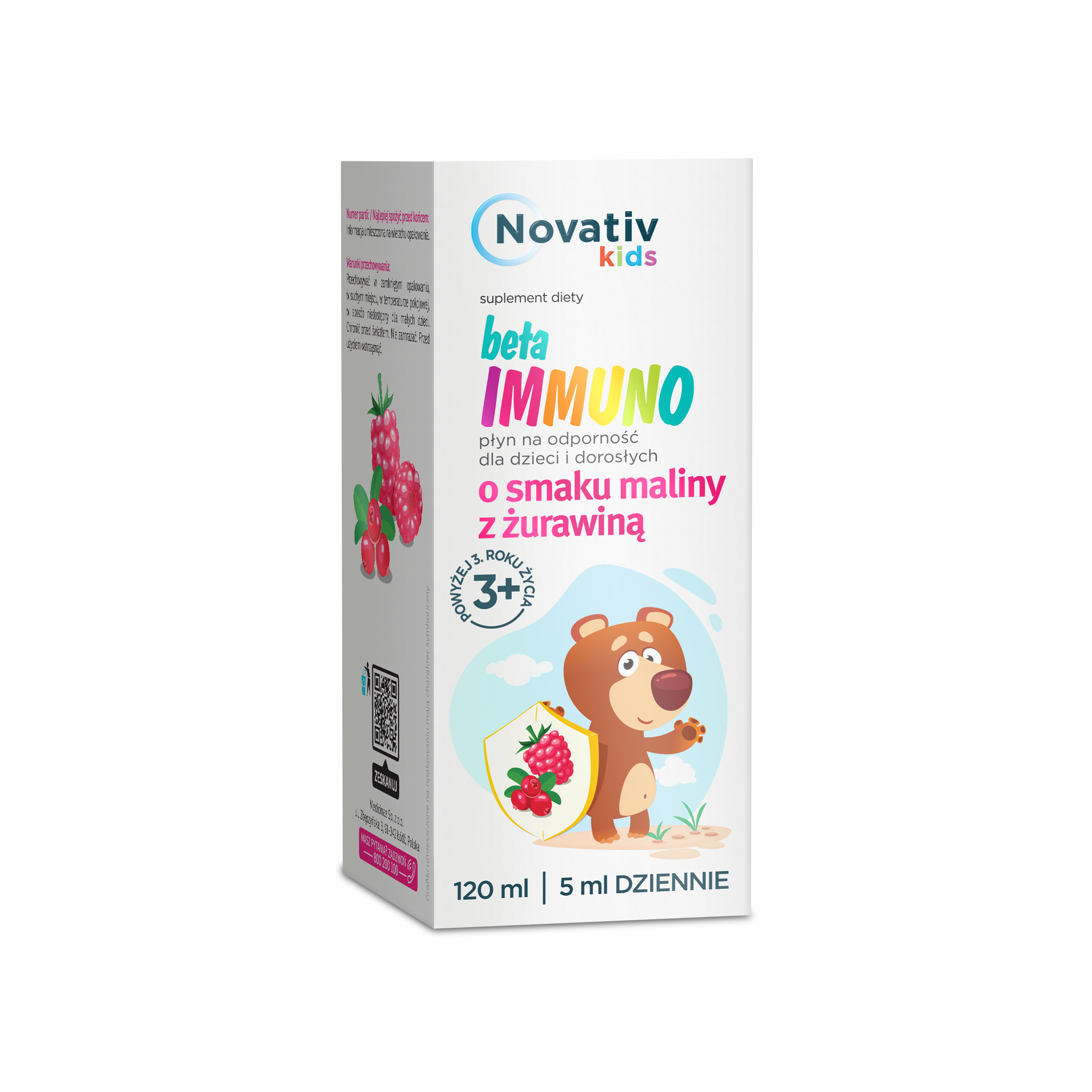 Novativ Kids Beta Immuno to suplement diety w formie płynnej, dedykowany dzieciom powyżej 3 lat oraz dorosłym. Posiada przyjemny smak maliny z żurawiną. Formuła produktu zawiera składniki wspierające naturalne mechanizmy obronne organizmu - beta-glukany z drożdży, witaminy C, D, B12 oraz L-argininę i cynk, będące nieodzowne dla wsparcia prawidłowego funkcjonowania układu odpornościowego. Produkt znajduje szczególne zastosowanie w okresach zwiększonego ryzyka przeziębienia czy grypy.