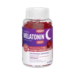PAMEX Melatonin Żelki to suplement diety w postaci żelek, przeznaczony dla osób dorosłych mających trudności z zasypianiem. Żelki zawierają melatoninę, która skraca czas potrzebny na zaśnięcie, a także wyciągi z rumianku i chmielu, które wspierają uspokojenie i relaksację. Witamina B6 przyczynia się do prawidłowego funkcjonowania układu nerwowego. Produkt jest odpowiedni dla wegan.
