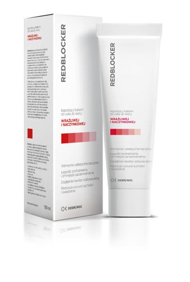 Redblocker łagodzący balsam do ciała to specjalistyczny dermokosmetyk przeznaczony do pielęgnacji skóry nawet bardzo wrażliwej i naczynkowej, skłonnej do podrażnień i zaczerwienień. Zawartość aż pięciu składników aktywnych sprawia, że balsam już po pierwszym zastosowaniu wzmacnia i uelastycznia naczynia krwionośne, chroniąc przed ich pękaniem. Dodatkowo, łagodzi podrażnienia i daje natychmiastowe uczucie ukojenia, przywraca odpowiedni poziom nawilżenia i dogłębnie odżywia skórę. Zawarte w balsamie składniki aktywne redukują uczucie suchości i swędzenia. Balsam wyraźnie poprawia kondycję skóry pozostawiając ją gładką, elastyczną i jędrną.