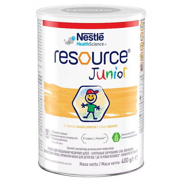 Resource Junior to produkt odżywczy o smaku waniliowym przeznaczony dla dzieci powyżej 1. roku życia. Jest to żywność specjalnego przeznaczenia medycznego, stosowana w przypadkach, takich jak przewlekłe biegunki, zaburzenia połykania, mukowiscydoza czy jadłowstręt.