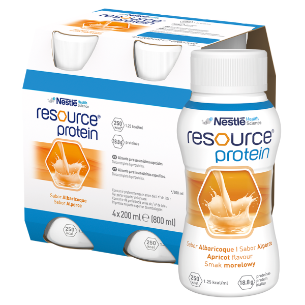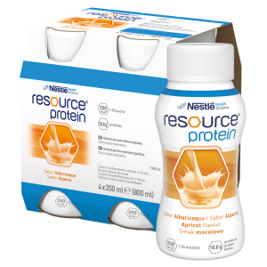 Resource Protein to wysokobiałkowy preparat odżywczy do postępowania dietetycznego w stanach niedożywienia lub ryzyka niedożywienia. Dostępny w smaku morelowym, pakowany po 4x200ml.