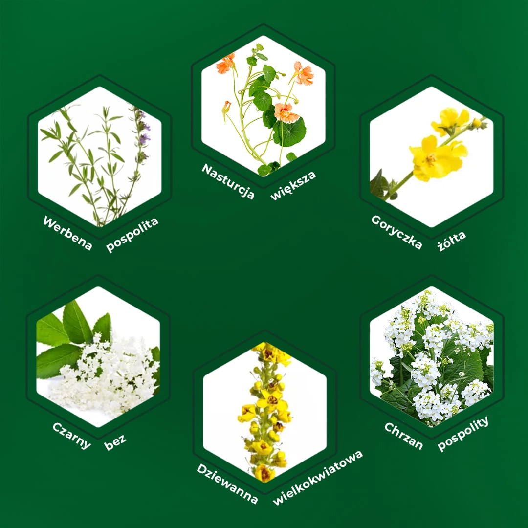 ➡ ️ Wysoka zawartość 6 naturalnych ekstraktów opracowanych w odpowiednim DER, by wyciąg był mocniejszy Nasturcja, chrzan, czarny bez, werbena, dziewanna, goryczka.