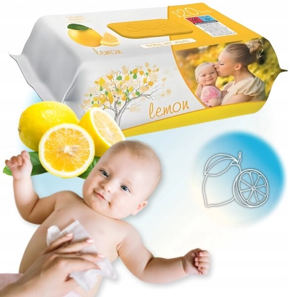 Nawilżane chusteczki Sleepy Lemon (120 szt.) o świeżym, cytrynowym zapachu do szybkiego odświeżenia i oczyszczenia skóry w domu oraz w podróży. Hipoalergiczne, bez alkoholu i parabenów. Odpowiednie dla dzieci i dorosłych. Praktyczne opakowanie z zamknięciem typu klips pomaga utrzymać wilgotność chusteczek.