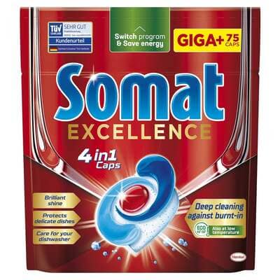 Rewolucyjne kapsułki Somat Excellence 4 in 1 dla doskonale czystych i błyszczących naczyń nawet w niskich temperaturach programu eco (45C) i krótkich cyklach.