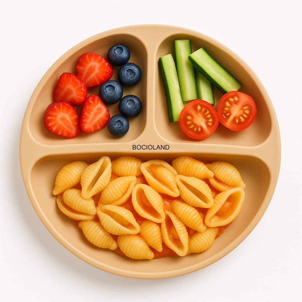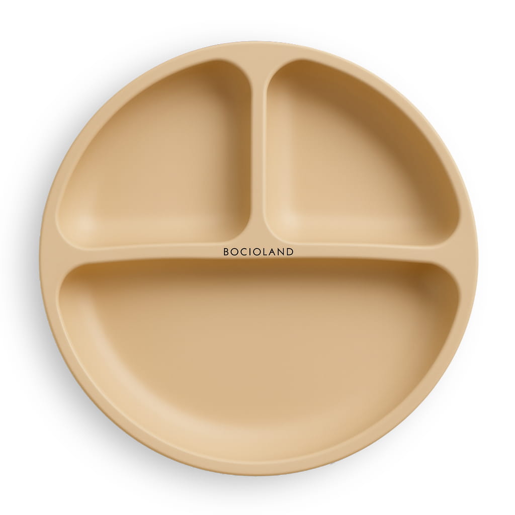 Beżowy talerzyk silikonowy Bocioland jest doskonałym wsparciem przy pierwszych posiłkach dziecka. Wykonany z bezpiecznego silikonu spożywczego, wolnego od BPA, PVC i ftalanów. Dzięki trzem komorom pozwala na serwowanie różnorodnych potraw bez ich mieszania oraz ułatwia odkrywanie smaków. Wyposażony w cztery mocne przyssawki, zapewnia stabilność i bezpieczeństwo, chroniąc przed rozlaniem jedzenia. Materiał jest elastyczny, co sprawia, że łatwo się czyści i jest odporny na różne temperatury. Może być używany w mikrofalówce, piekarniku i zmywarce, a także przechowywany w zamrażarce. Produkt posiada certyfikaty bezpieczeństwa CE i OEKO-TEX.