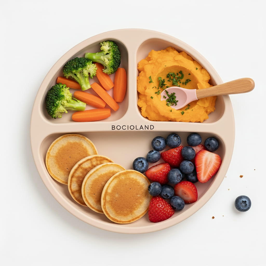 Silikonowy talerzyk z trzema przegródkami i czterema przyssawkami. Idealny dla dzieci od 6 miesiąca, zapewnia stabilność podczas pierwszych prób samodzielnego jedzenia.