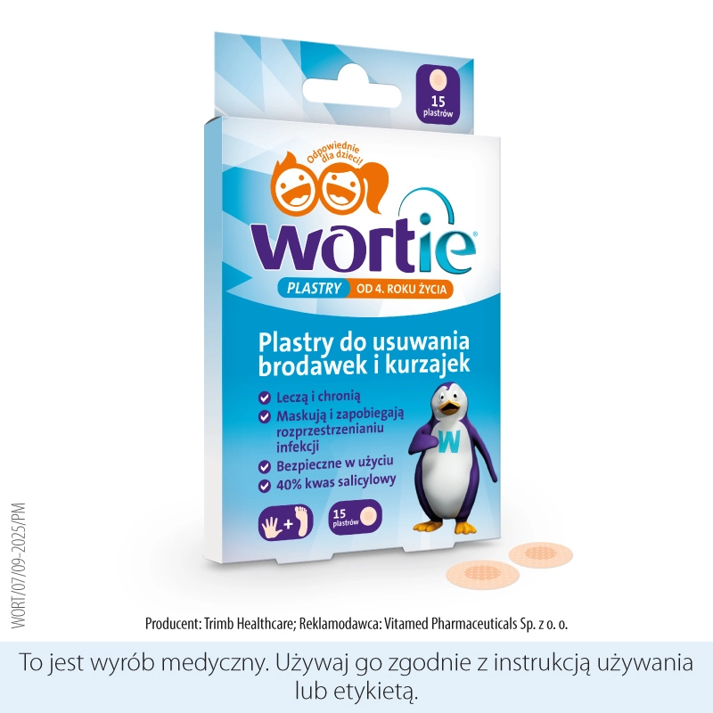 Wortie to plastry przeznaczone do miejscowego usuwania brodawek (kurzajek) na dłoniach i stopach. Zawierają 40% kwas salicylowy, który działa keratolitycznie – powoduje chemiczne złuszczanie zrogowaciałego naskórka oraz wspiera odnowę komórkową. Dzięki temu zmiana stopniowo obumiera i zanika, a w miejscu kurzajki tworzy się nowa, zdrowa skóra.